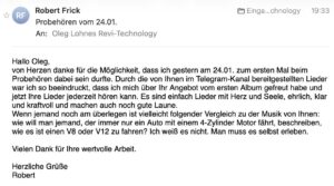 Aus den neuen Revi-Musikalben hat mir Oleg dankenswerter Weise ein paar seiner neu komponierten Songs geschenkt, die mir in vielerlei Hinsicht sehr gut getan haben und mich beim Anhören durch ihre gesamte Auswirkung sehr bereichert haben.