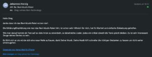 Ich freue mich schon sehr auf das nächste Probehören und die pure Faszination und Freude der Zuhörer zu sehen, wenn sie die ersten Lieder gehört haben und selbst erleben, was so viele mit ihren Erfahrungsberichten schon über Deine Revi-Musik erzählt haben.