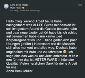 Die Wertschätzung für Olegs Arbeit erfüllt mich mit Liebe und seelischer Dankbarkeit und da laufend neue Mehrwerte dazukommen ist Olegs Arbeit für mich persönlich von unendlichem Wert, nicht mit Worte vollumfänglich zu beschreiben und schon gar nicht in Zahlen – Oleg, deine Arbeit, deine Werke, deine Erfindungen und damit DU als Mensch machst LEBEN als Mensch LEBENSWERT.