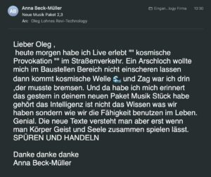 Als mir erfüllt von Dankbarkeit für Olegs Arbeit immer bewusster wurde, welchen Wert Olegs Revi-Musik für mich und uns alle in der Praxis haben können, fühlte ich mich immer besser, fitter und dadurch so viel klarer im Kopf – da überholte mich ein Auto und fuhr dann vor mir wieder rechts rein – “komisch, denke ich, warum fährt er direkt vor mir wieder auf die rechte Spur“? als ich dann den Text auf der Heckscheibe gelesen habe, wurde mir alles klar: „VOICE OF THE SOUL.ME“ – Die Stimme der Seele – das ist mein wahres ICH, mein wahres Selbst (so habe ich es für mich gefühlt übersetzt).