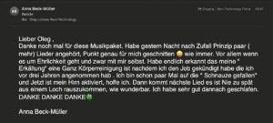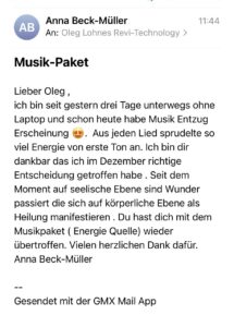 Lieber Oleg, nachdem du uns an Silvester eingeladen hast, deine Lieder bei dir im Seminarraum auf deiner einzigartigen Musikanlage zu präsentieren und am letzten Wochenende die Jahrestrainingsgruppe deine einzigartigen Kompositionen hören durften, ist meine Vorfreude auf die kommenden Revi-Musik Pakete schon sehr sehr groß. Du übertriffst dich mehr und mehr. So fein abgestimmt, so herzergreifend, so komplexe Stücke. So poetisch. Diese Bandbreite an Musik führt fast automatisch zum dynamischen Denken und Handeln. Weil ich schon so viel von deinem ersten Revi-Musik Paket profitiert habe, möchte ich mich auch noch mal ganz herzlich bedanken. Das Angebot für schnell entschlossene zum halben Preis war schon mehr als ein Überraschungsgeschenk. Oleg, egal, welchen Preis du am Ende für deine kommenden Revimusikpakete aufrufst, es ist jeden Cent wert. Allein für dieses Revi-Musik Paket lohnt es sich, morgens aufzustehen und zur Arbeit zu gehen. Am besten gleich mit deiner ReviMusik auf den Ohren und sofort guter Laune❤️ Liebe Grüße Uli